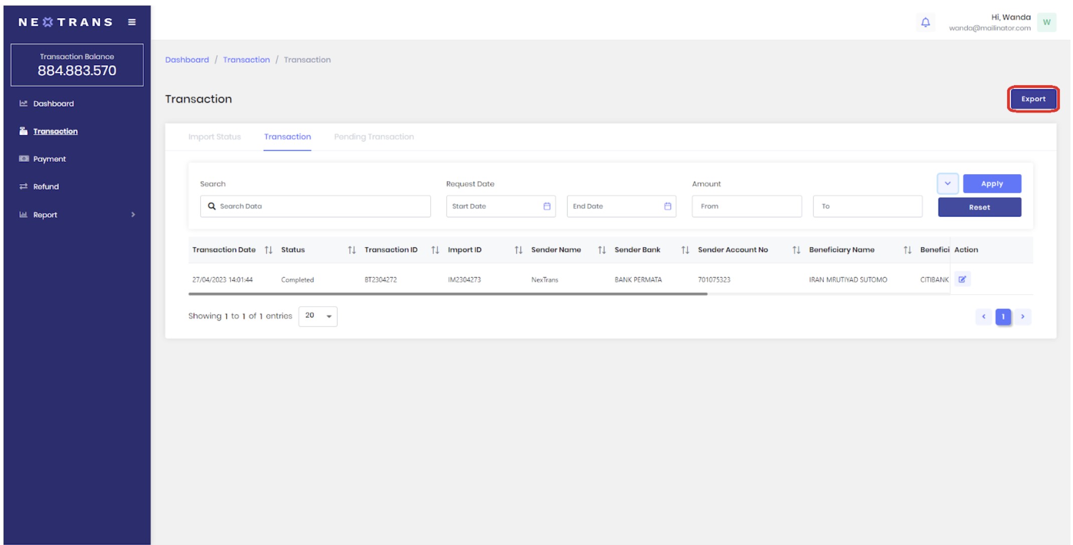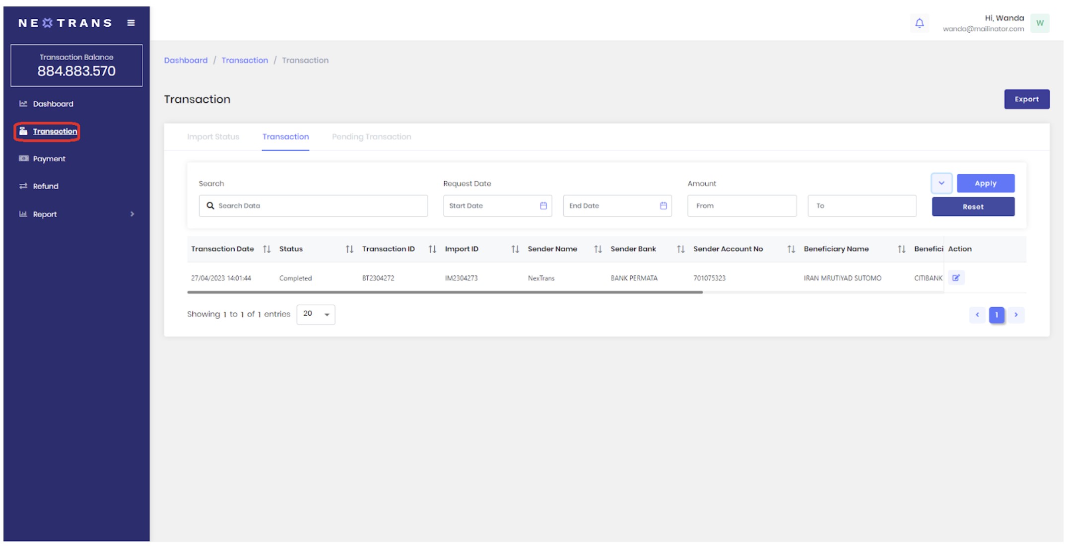 Pilih menu Transaction di bagian kiri dashboard Nextrans