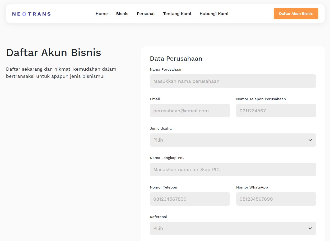 Melalui halaman website di atas, silahkan isi data usaha anda dan klik tombol “Daftar Akun Bisnis”, anda akan mendapatkan email konfirmasi pendaftaran setelah melakukan pendaftaran. Setelah mendapatkan email konfirmasi pendaftaran, Tim Bisnis Representatif Nextrans akan menghubungi anda dalam jangka waktu 3x24 jam. Anda sudah dapat menggunakan fitur Nextrans menggunakan email dan kata sandi yang dikirimkan ke email terdaftar. Anda dapat mengatur ulang kata sandi yang dikirimkan oleh tim Nextrans dengan kata sandi yang anda inginkan. kata sandi harus memiliki minimal 8 karakter dengan kombinasi huruf kapital (A-Z), huruf kecil (a-z), angka, dan simbol. Melalui halaman website di atas, silahkan isi data usaha anda dan klik tombol “Daftar Akun Bisnis”, anda akan mendapatkan email konfirmasi pendaftaran setelah melakukan pendaftaran. Setelah mendapatkan email konfirmasi pendaftaran, Tim Bisnis Representatif Nextrans akan menghubungi anda dalam jangka waktu 3x24 jam. Anda sudah dapat menggunakan fitur Nextrans menggunakan email dan kata sandi yang dikirimkan ke email terdaftar. Anda dapat mengatur ulang kata sandi yang dikirimkan oleh tim Nextrans dengan kata sandi yang anda inginkan. kata sandi harus memiliki minimal 8 karakter dengan kombinasi huruf kapital (A-Z), huruf kecil (a-z), angka, dan simbol.